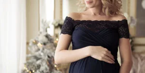 Beautiful Pregnant Woman In A Holiday Dress. Christmas Tree Back